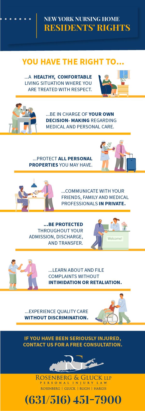 You have access to a document called Your Rights as a Nursing Home Resident in New York State and Nursing Home Responsibilities. This document provides the necessary information regarding your protections by law. Below our Long Island personal injury lawyers have compiled a list of rights you need to know: